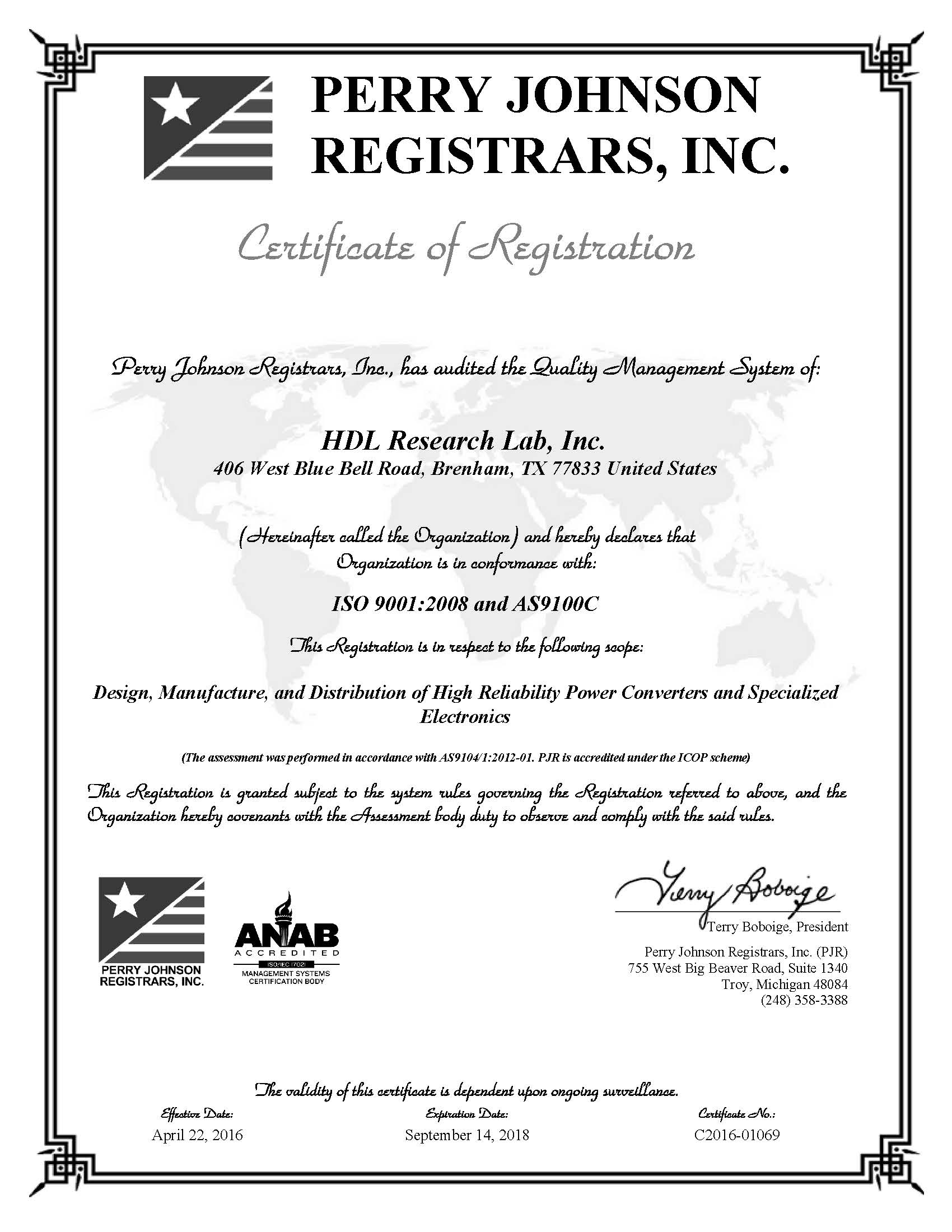 HDL's Certification to ISO 9001 was awarded in 2004 and is valid through September 14, 2018.